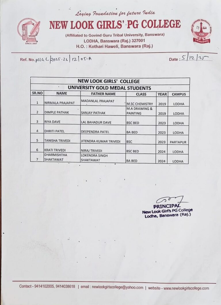 The Gold Medalists from New Look Girls are: Ms. Nirmala Prajapat (M.Sc, Chemistry) & Dimple Pathak (M.A, Fine Arts).