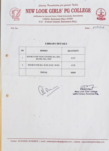 The College library plays a great role in the life of students by serving as the storehouse of knowledge. It encourages innovation and thirst for knowledge among Student. It provides support for learning and teaching throughout the College. The College library exhibits a positive impact on the academic achievement of the student, as it helps in developing the mind of the student.